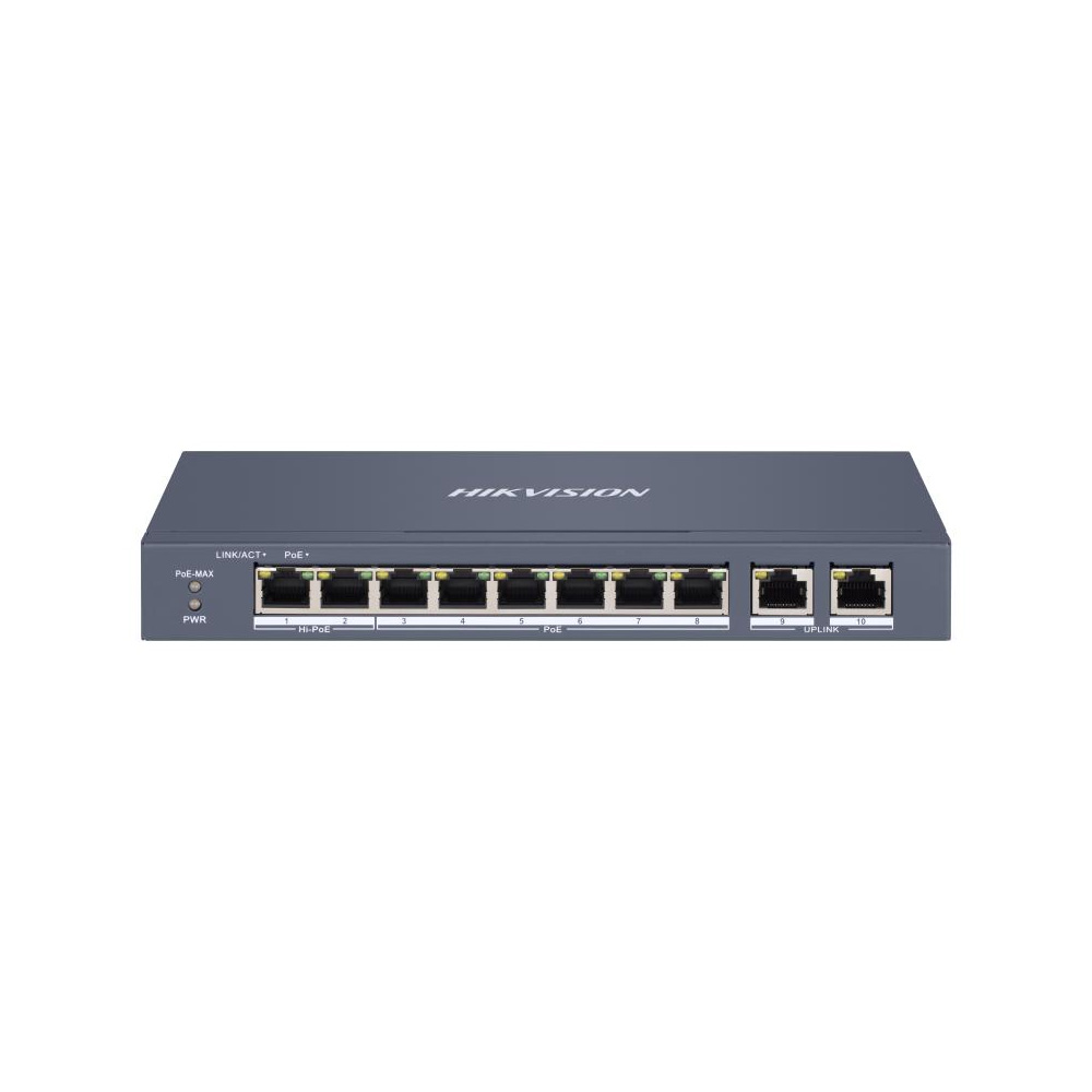 Deze Hikvision Smart managed PoE Switch heeft 8 poorten , 8 × 100 Mbps PoE RJ45-poorten en 2 × 1000 Mbps poorten., Hoog vermogen standaard IEEE 802.3at / af/bt, PoE-stroombudget 110 W